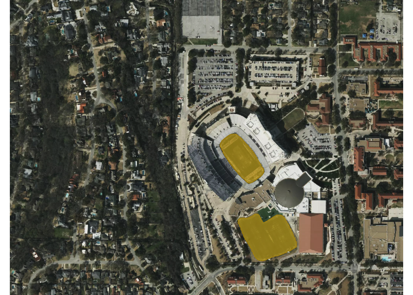 Let’s detect football fields on the TCU campus in Fort Worth. The sam_detect() function is the main workhorse for satellite imagery detection. You provide a bounding box, describe what you’re looking for with a text prompt, and geosam handles the rest—downloading imagery, running SAM3 inference, and returning georeferenced results.