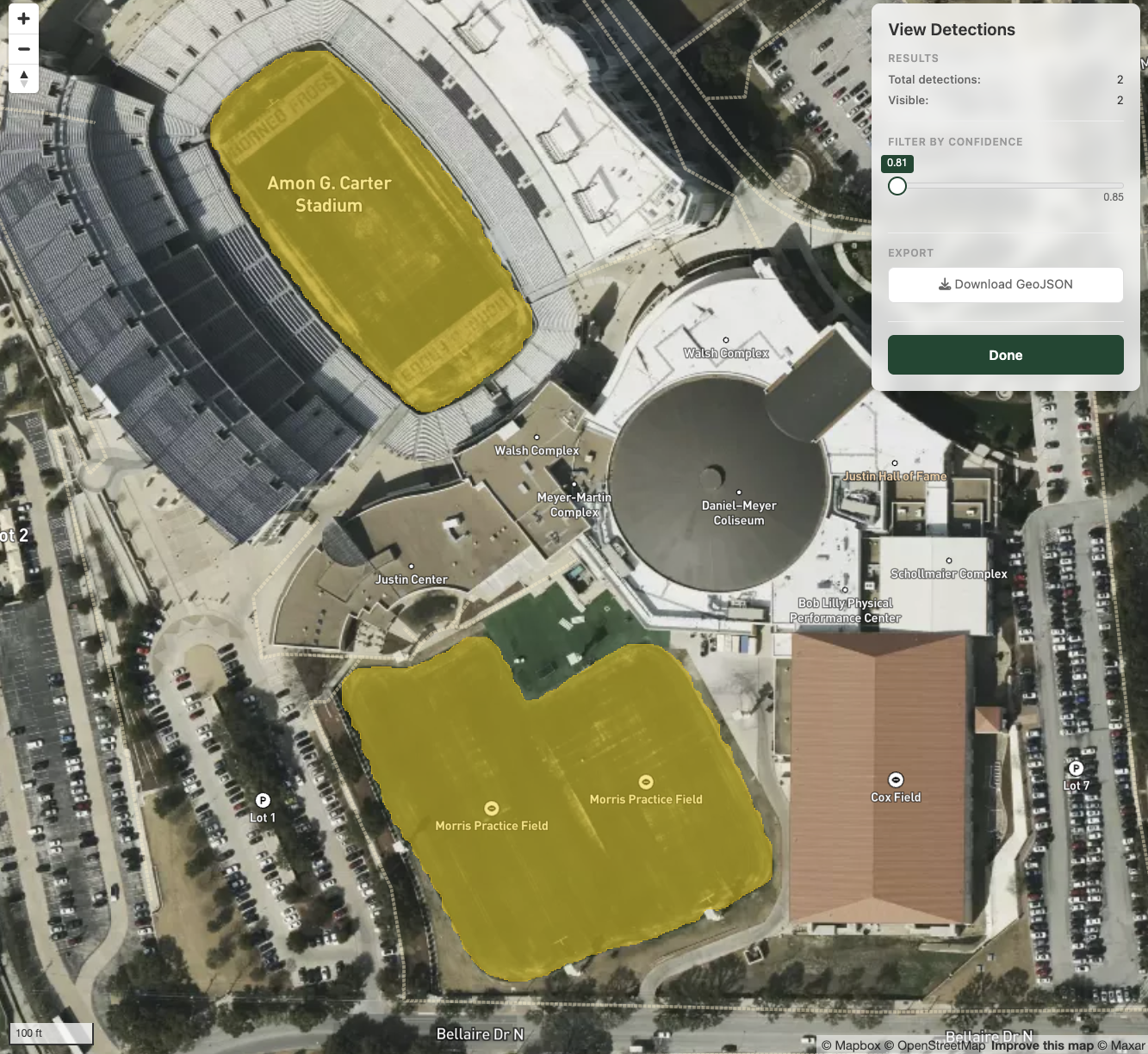 This opens a Shiny application with the satellite imagery as a basemap and your detections overlaid as polygons. You can adjust the confidence threshold with a slider to filter out lower-quality detections, and click on individual polygons to see their confidence scores. Here, we’ve picked up the field inside the football stadium as well as the nearby practice field.