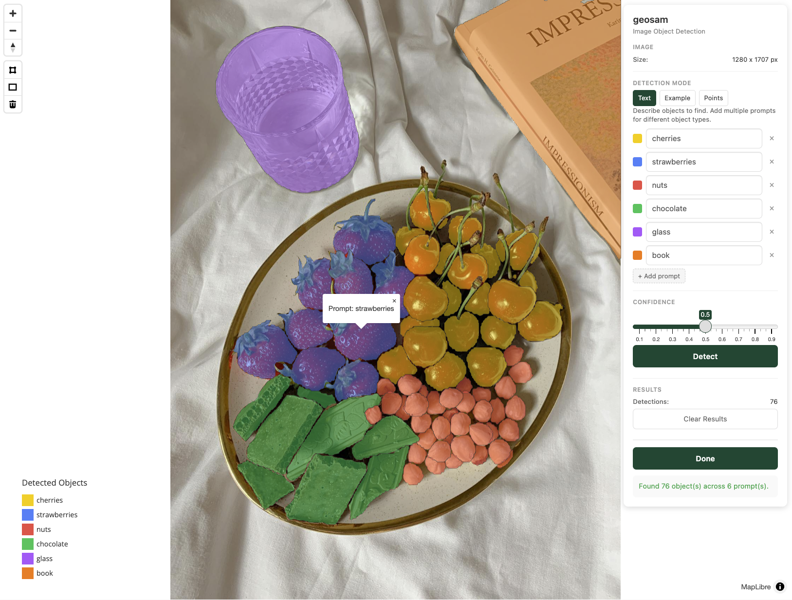 result <- sam_explore_image(fruit)The text option allows you to enter up to six text prompts to extract interactively from the image. Here, we show an extraction detecting cherries, strawberries, nuts, chocolate, glass, and book from the image. Our interactive viewer finds all of these objects, and gives us a map legend along with pop-ups.